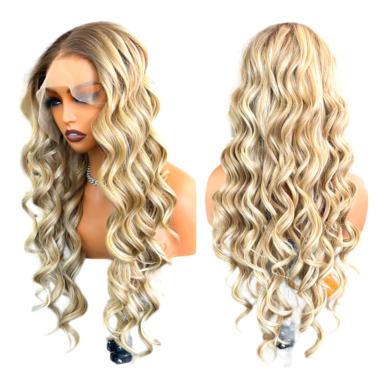 Our synthetic wigs are the perfect wig for those who want a low-maintenance, natural looking hair solution. This pre-plucked lace front wig features 13×6 density 150% density synthetic fibre for a full, lush look without being heavy or uncomfortable. The transparent, glueless lace front means you can part the wig naturally anywhere while the soft, breathable cap makes it suitable for all-day wear. The soft, smooth fibres on this wig shed minimally and have been styled into natural-looking waves that frame the face in a universally flattering way.